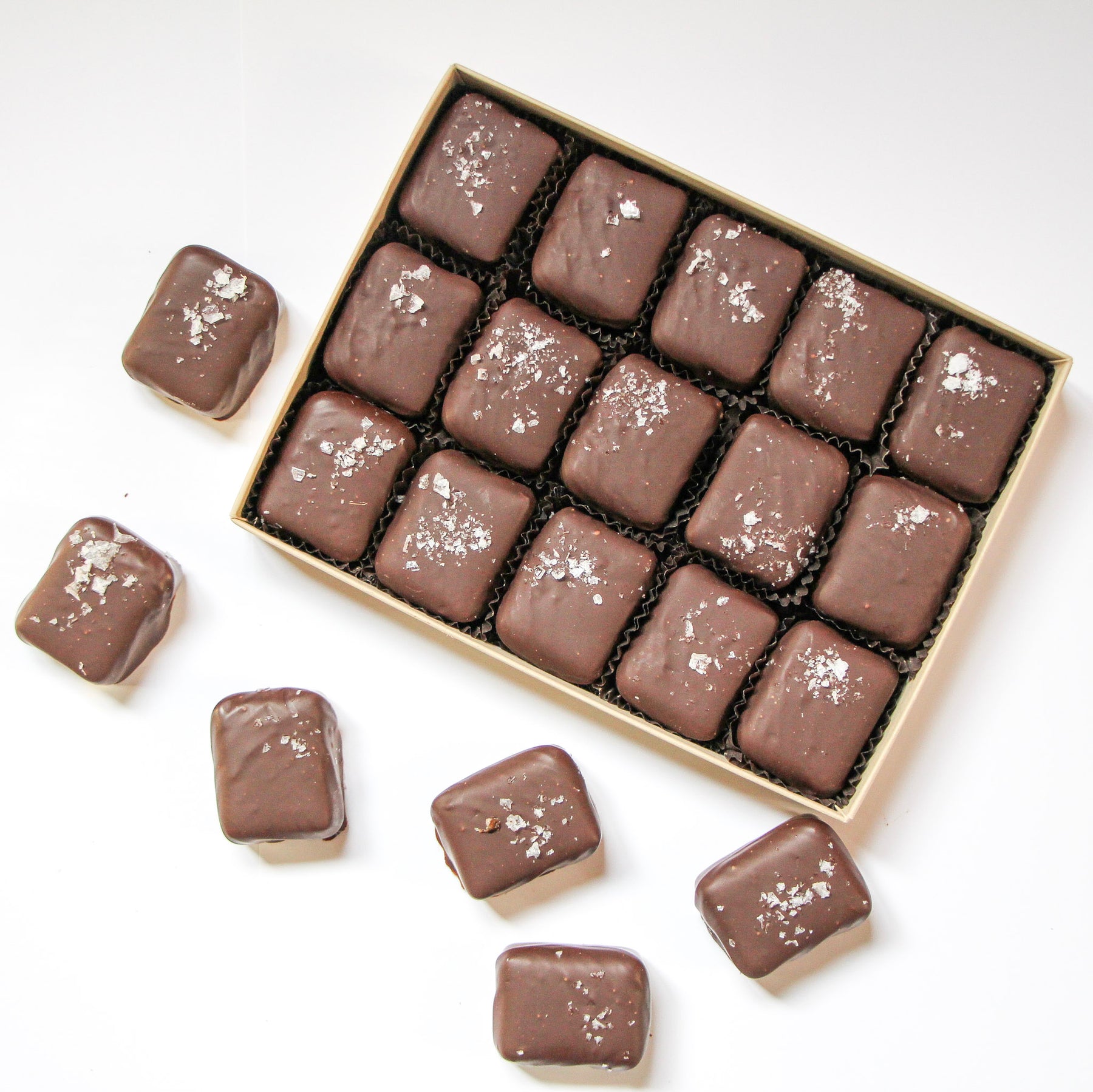 Chewy and flavorful chocolate covered caramels garnished with flake sea salt.
